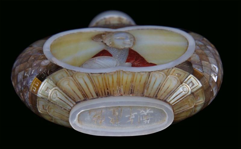 Mother-of-pearl snuff bottle with female profile, China, Qing Dynasty, beginning 19th century four-character post mark Qianlong under the base, h cm 7
