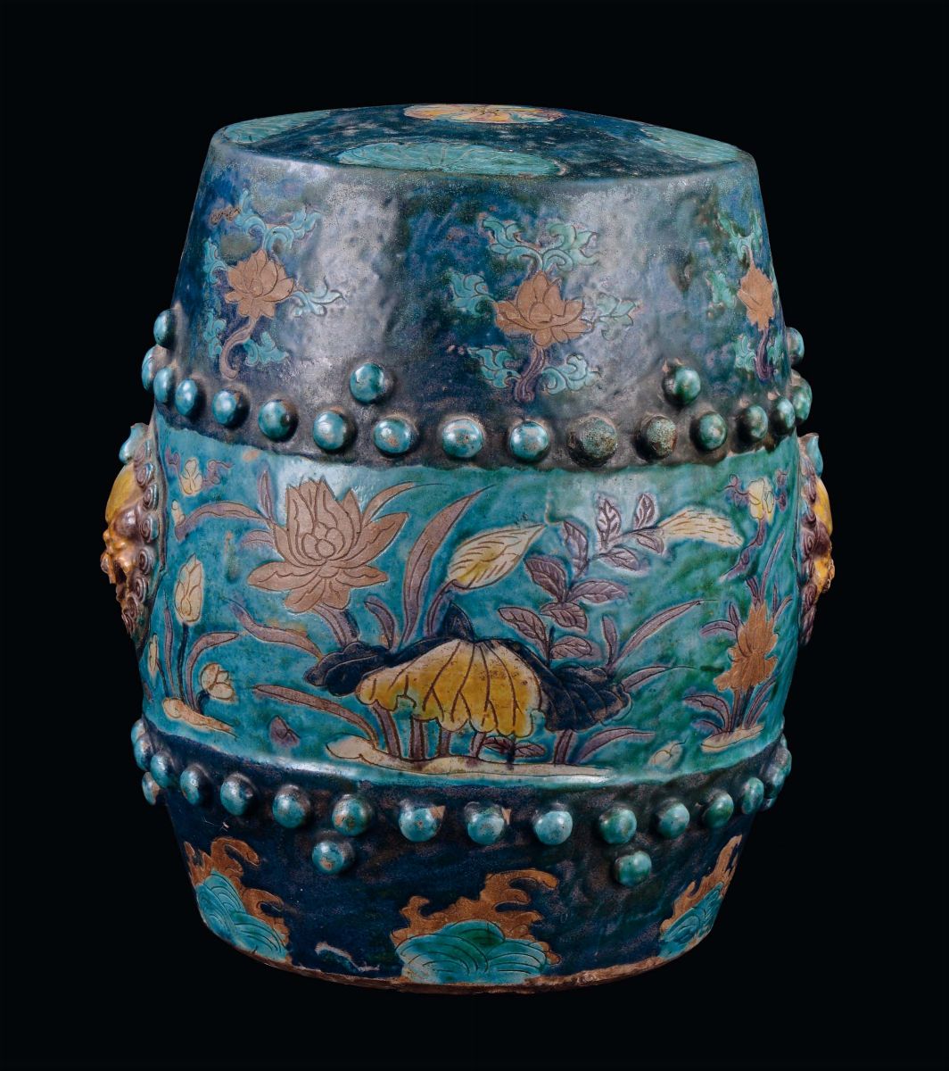 Porcelain garden stool, China, Ming Dynasty, 16th century vegetable decoration on light blue background, h cm 36