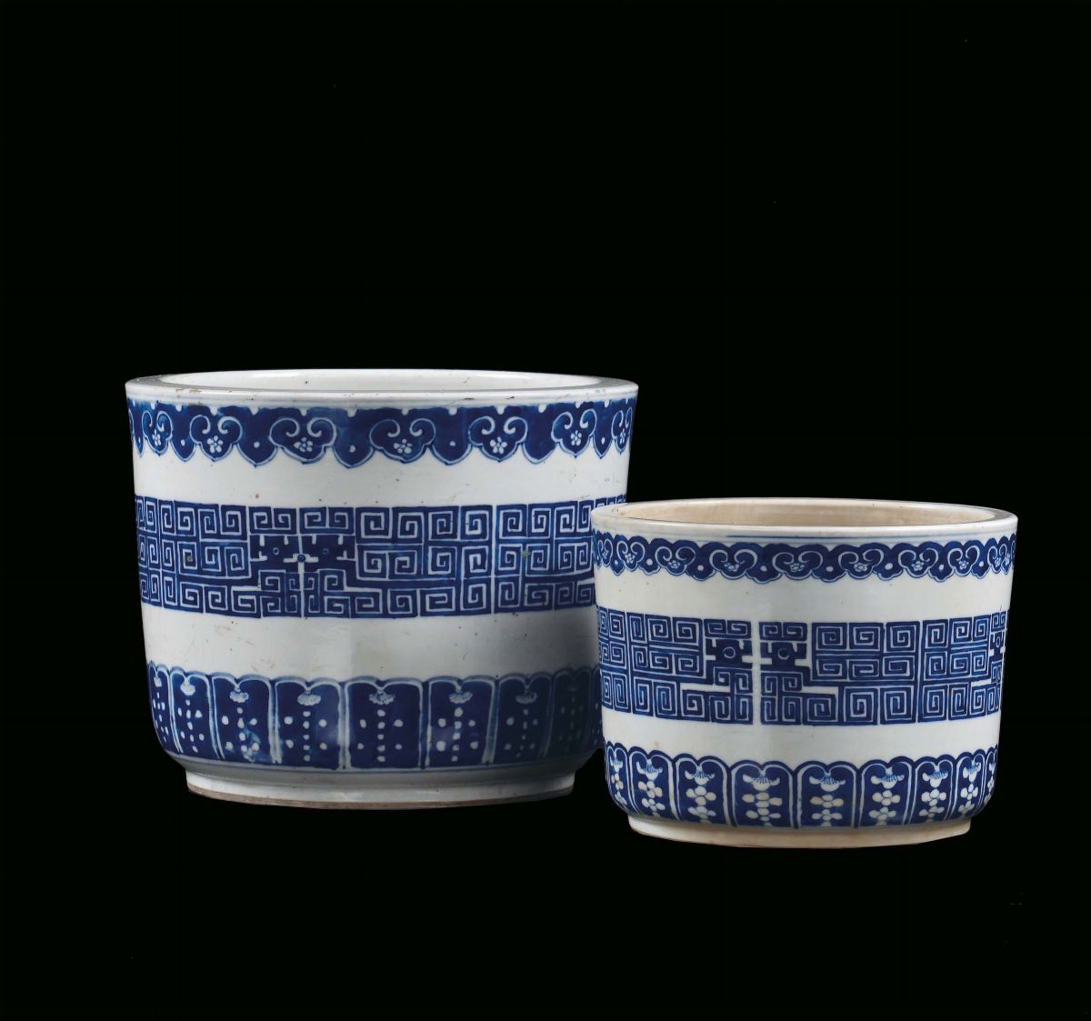 Set of two white and blue porcelain cachepots, China, Qing Dynasty, 19th century cm 25x20 and cm 20x15