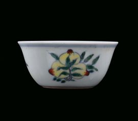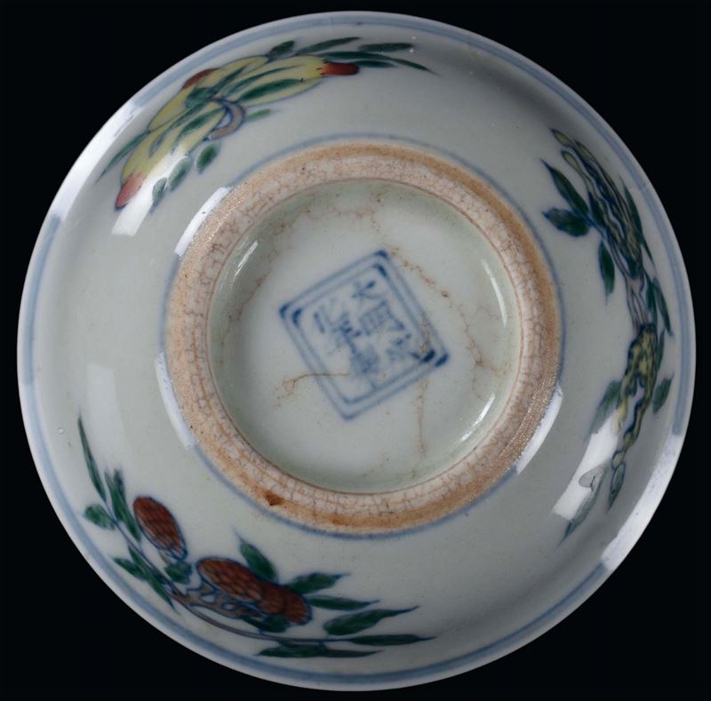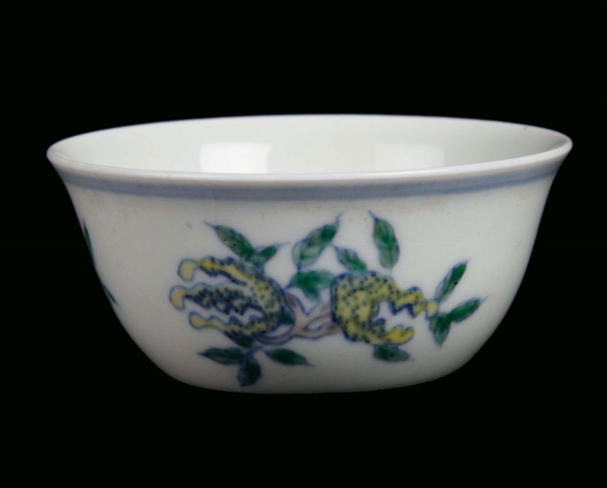 Small polychrome porcelain cup with naturalistic decoration, China, Qing Dynasty, Qianlong Period (1736-1795) post marked Chenghua under the base, diameter cm 8, h cm 4