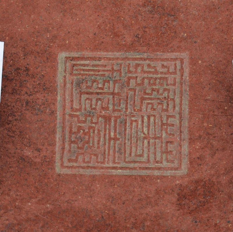Stoneware pumpkin shaped Yixing teapot, China, Qing Dynasty, 19th century brown background with Pho-dog on the cover, marked, [..]