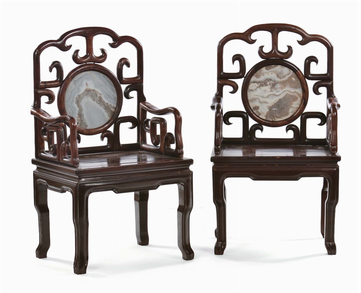 Two Homu wood chairs with armrests with marble inserts, China, Qing Dynasty, 19th century cm 66x52x52