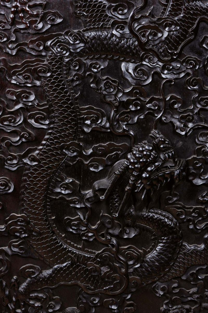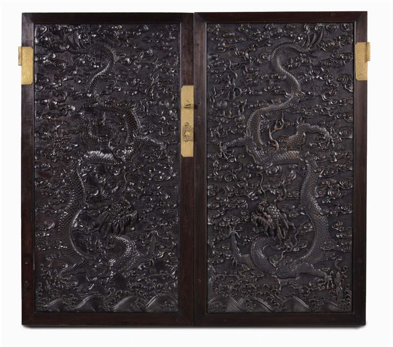 Two Zithan panels carved with dragons, carved gilt bronze hinges, China, Qing Dynasty, Qianlong Period (1736-1795), cm 130x71