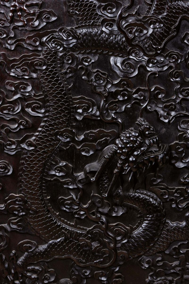 Two Zithan panels carved with dragons, carved gilt bronze hinges, China, Qing Dynasty, Qianlong Period (1736-1795), cm 13 [..]
