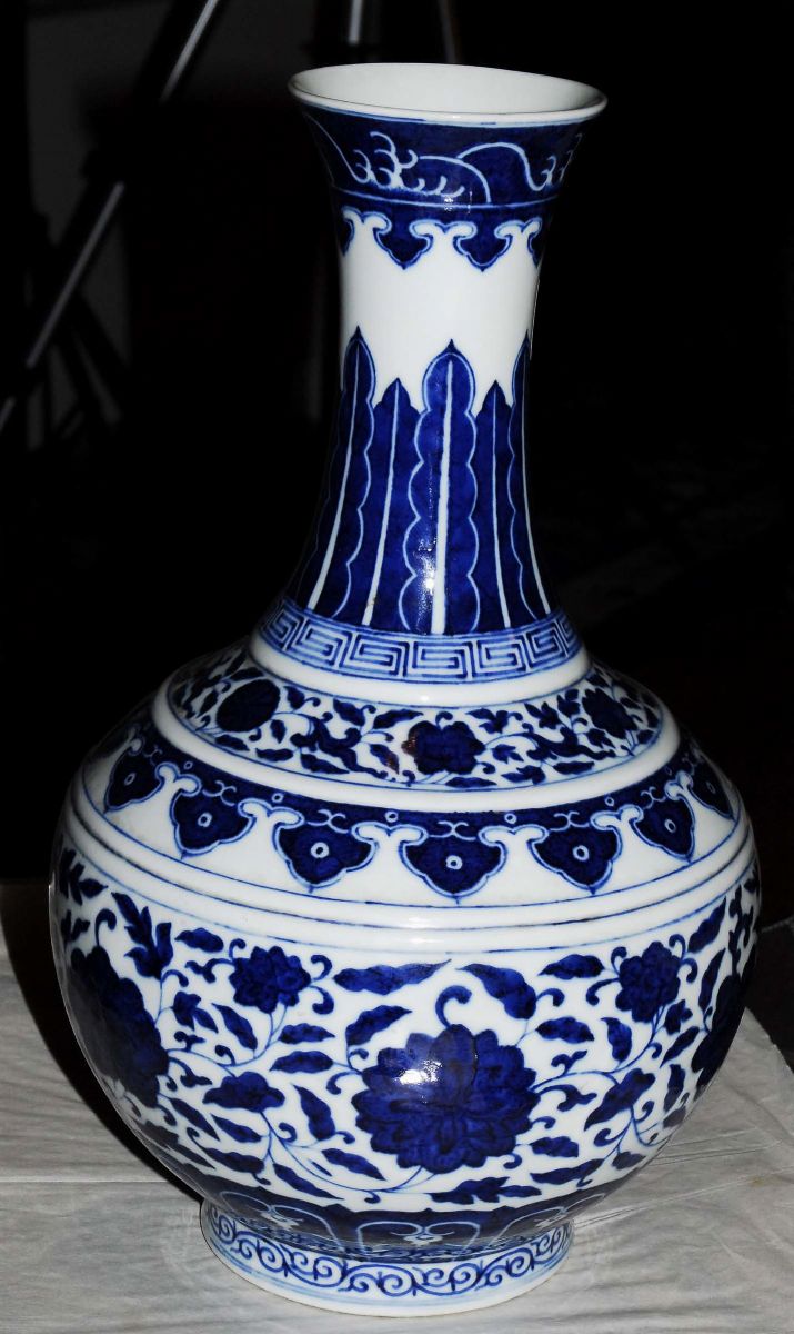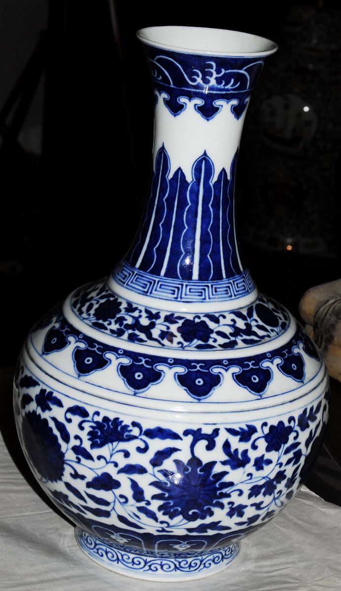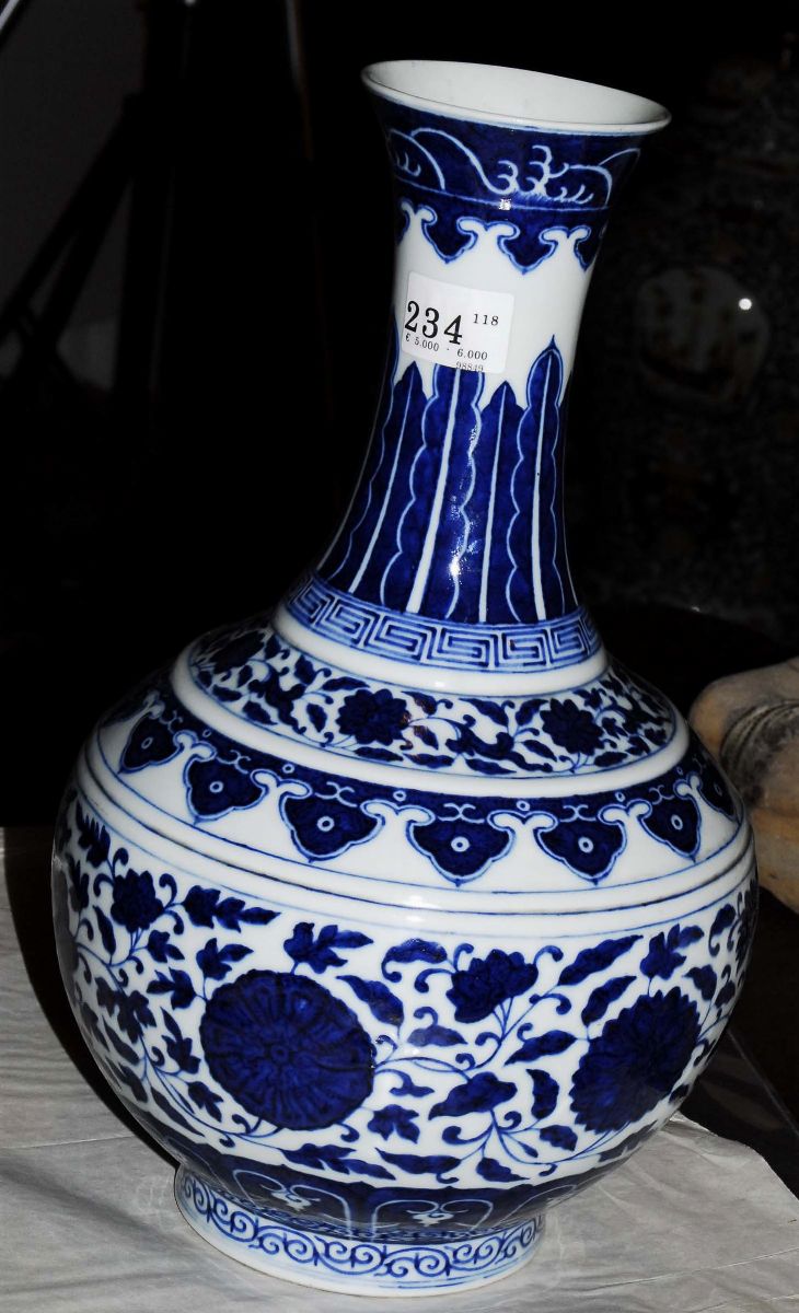 White and blue porcelain flask, China, end 19th century floral decoration, neck with waves decoration on the top, mark of the Guangxu period h cm 39