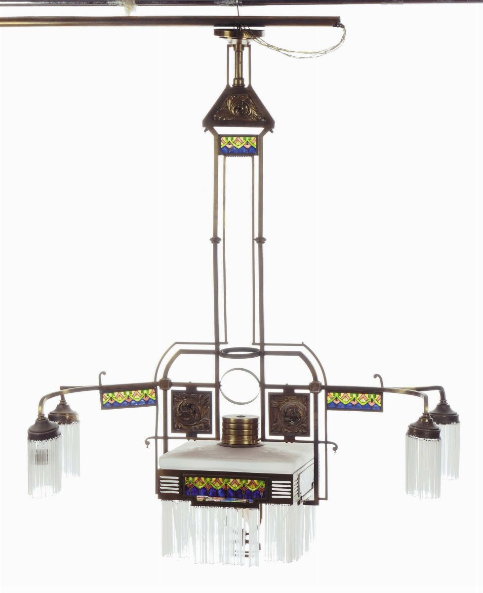 struttura a disegno geometrico in ottone, plafoniera centrale quadrata in vetro bianco e due bracci laterali a quattro luci. Decorato con vetri policromi e elementi floreali. Altezza cm 140, larghezza massima cm 115