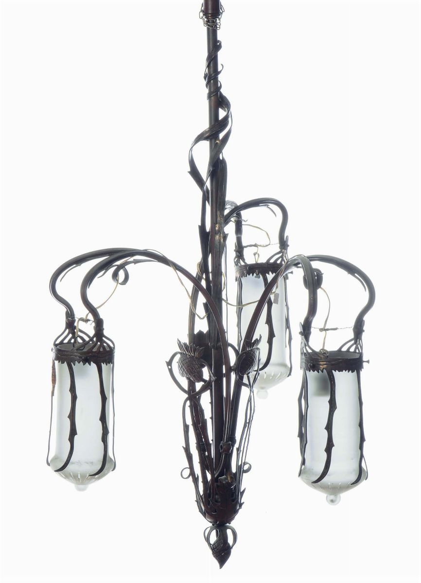 in ottone a tre bracci decorato con elementi a volute floreali, Epoca Liberty. Altezza cm 170