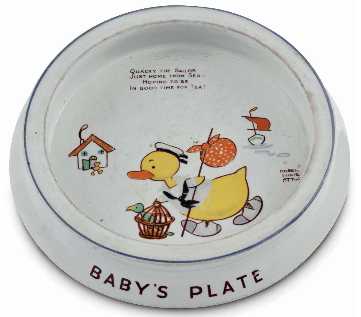 Lotto composto da un piatto per bambini e un servizio da tè composto da tre pezzi . Ceramica decorata a policromia. 1930 circa.