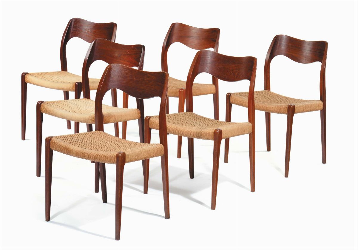 legno di teak, seduta in paglia. Prod. J.L. Moller, 1950 circa.
