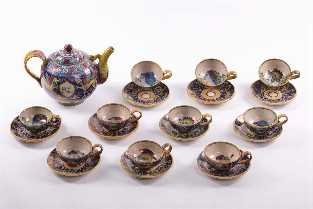 Lotto composto da nove piattini, nove tazzine e teiera. Terracotta maiolicata decorata con smalti iridescenti; l'interno della tazzina raffigura un volto femminile, l'esterno è decorato con figure fantastiche e l'iniziale RC entro scudo.