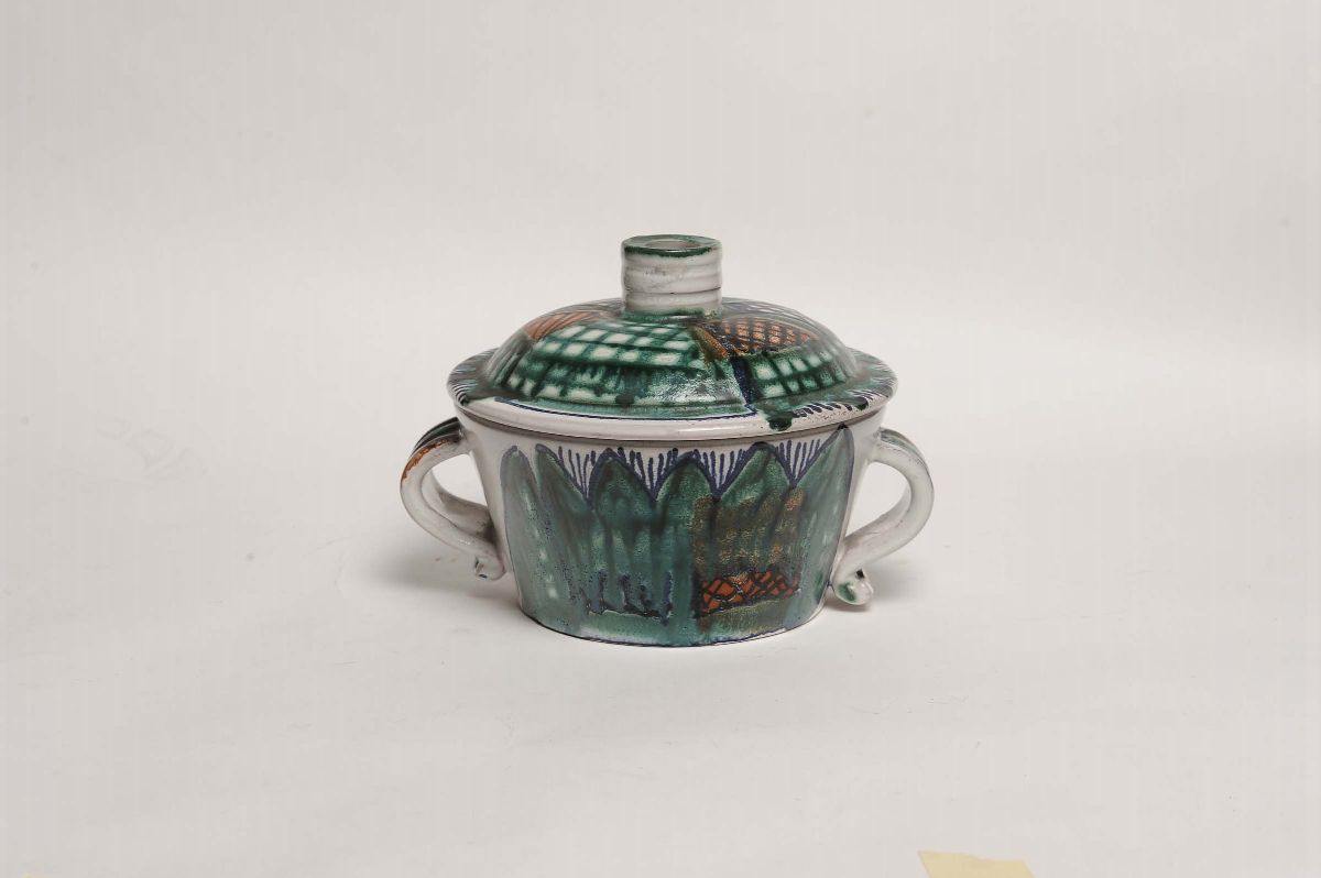 terracotta maiolicata decorata in policromia. Sotto la base: Vallauris Grand... 1950/60. Altezza cm 15, diametro cm 22
