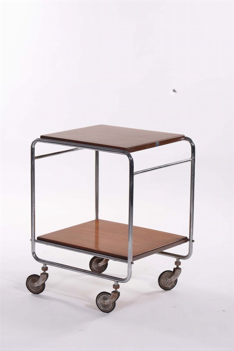 carrello portavivande. Struttura in tubolare d'acciaio, due ripiani in legno. Etichetta sul lato del piano superiore. cm 50x59, altezza cm 77