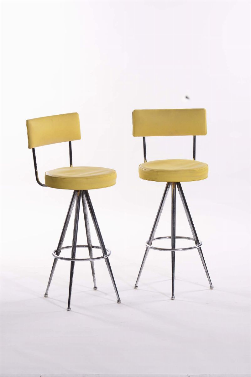 coppia di sgabelli , struttura in acciaio, seduta e schienale in similpelle. Etichetta sul retro. Altezza cm 92.