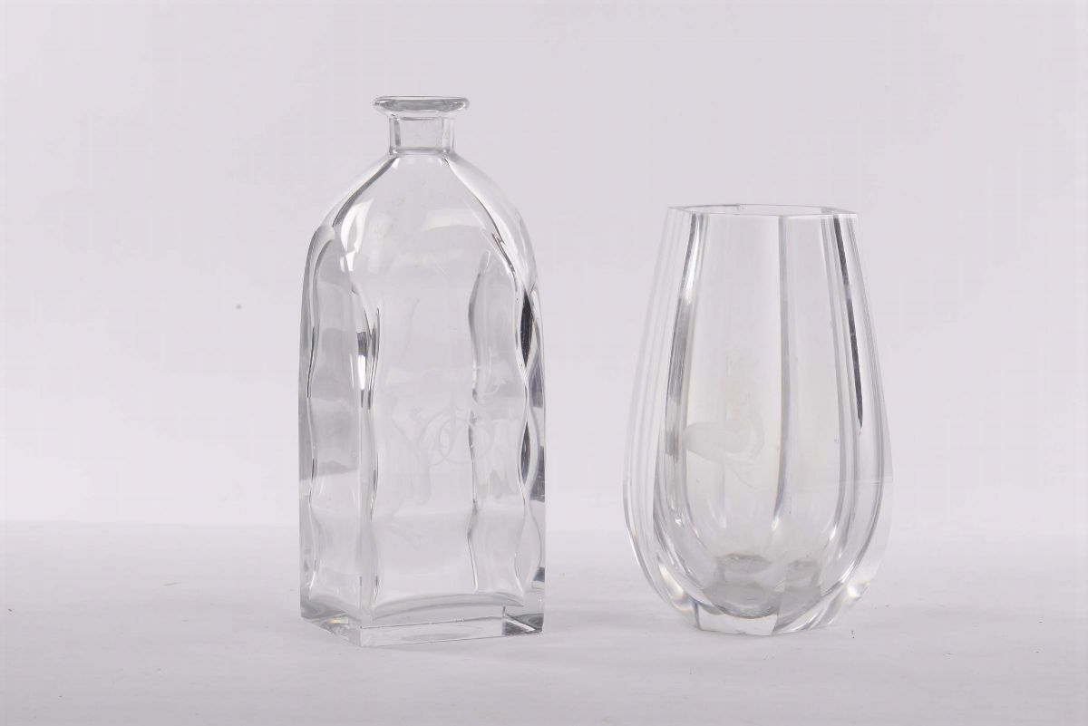 cristallo inciso alla ruota con decoro di sirena per il vaso e di nuotatrice per la bottiglia. Sotto le basi firma della manifattura e sotto la bottiglia: Lindstrad. Altezze cm 19,5 e cm 25