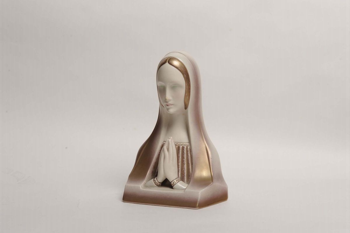 terracotta maiolicata, formata a colaggio, decorata all'aerografo in viola e rifinita a mano con smalto dorato. Sotto la base: Lenci Made in Italy TK. Altezza cm 21