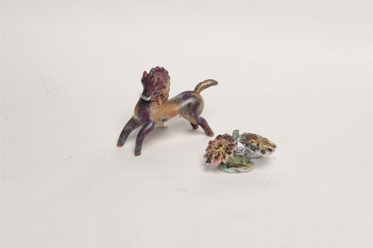 Lotto comprendente: cavallino in ceramica decorato con smalti iridescenti viola, ocra e verdi; composizione naif con due fiori con ape. Ambedue gli oggetti firmati dall'autore. Cavallino altezza cm 17,5, lunghezza cm 14; fiori altezza cm 4, larghezza cm 9