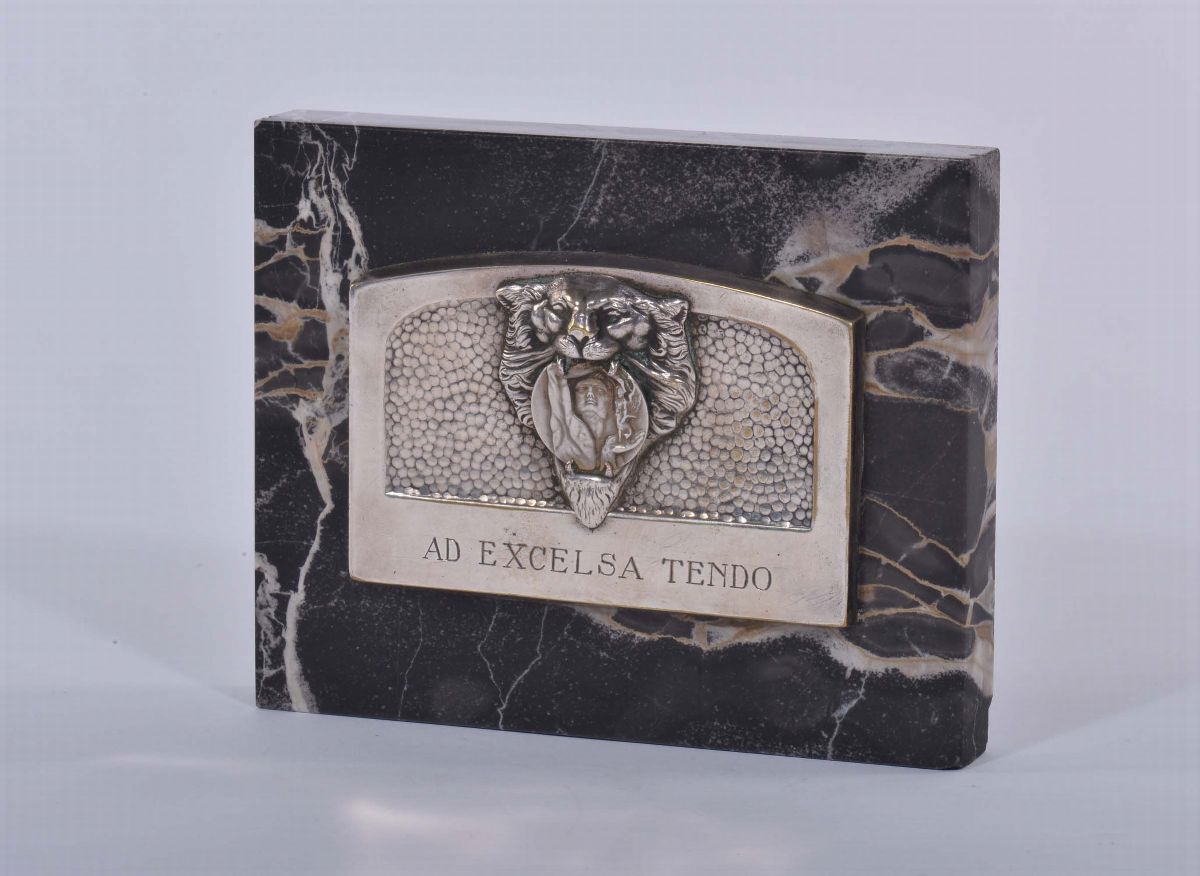 Metallo argentato lavorato a sbalzo raffigurante belva che tiene tra le fauci tondo con Duce e Vittoria. Inciso il motto Ad Excelsa Tendo. La placca poggia su base rettangolare in marmo. Dimensioni: cm 12 x cm 15