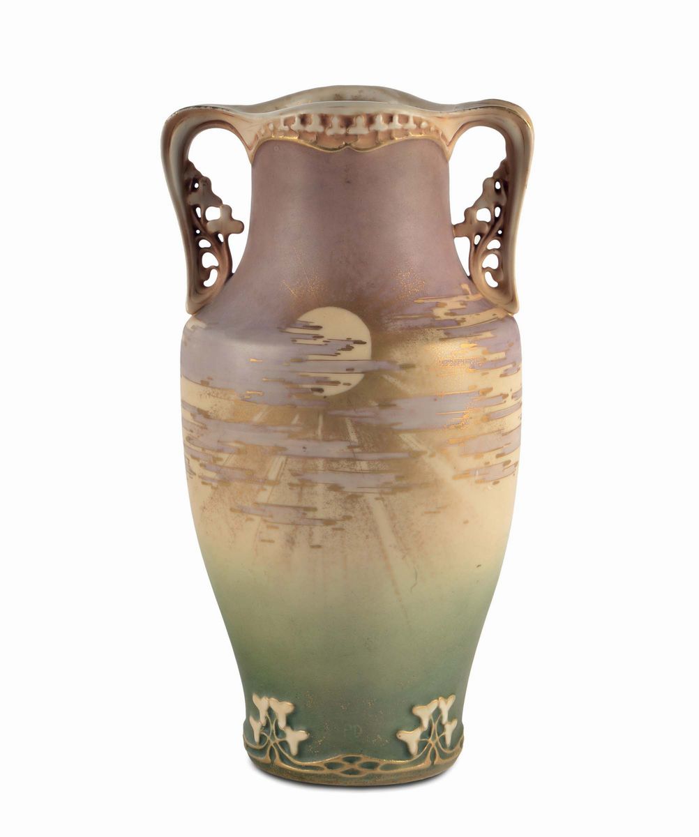 porcellana color avorio dipinta in verde, viola e oro con decoro di sole e nubi. Sotto la base marchio della manifattura, 1900 circa. Altezza cm 33