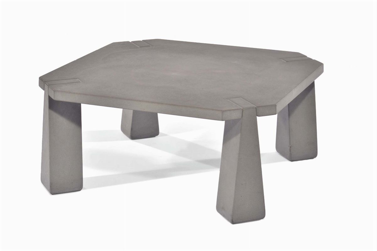 Tavolo mod. “Incas” in pietra serena extraforte (inizialmente proposta in pietra serena in una finitura sabbiata ideale anche per ambienti esterni), con piano di forma ottagonale e gambe a forma di tronco-piramidale con sezione trapezoidale, cosicché solo i due piani inclinati sopportino le sollecitazioni dovute al peso del piano, mentre quelli verticali non collaborino alla tenuta del sistema costruttivo, cm 90x90x42.Produzione Skipper, Italia 1980 ca.