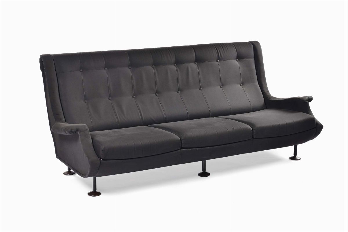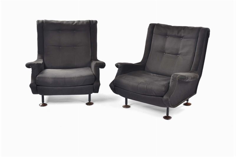 coppia poltrone e divano mod. Regent, gambe in ferro verniciato, piedini in palissandro. Produzione ARFLEX, Italia 1960 ca., cm 82x84x84.