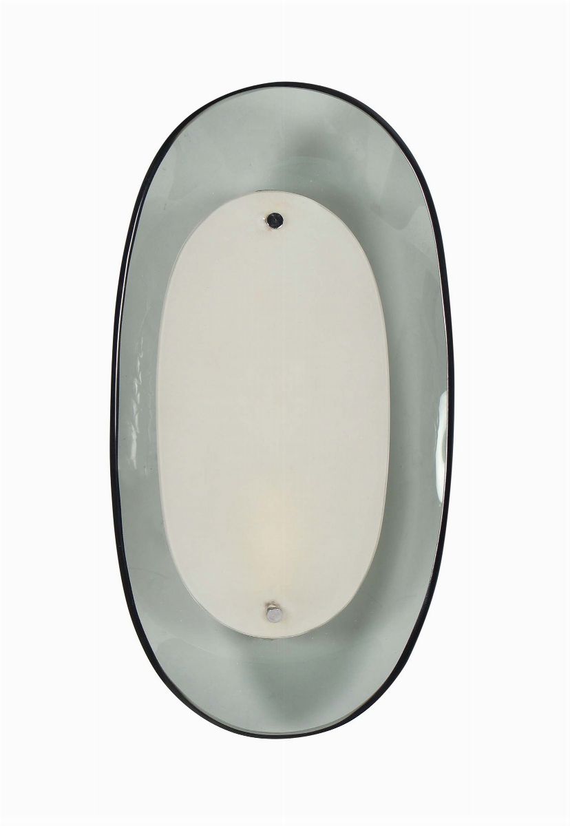 Coppia di lampade da parete in vetro curvo colorato molato e schermo in vetro bianco opalino.Italia 1950 ca.