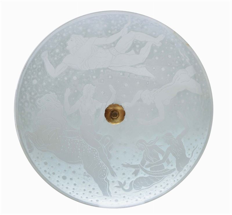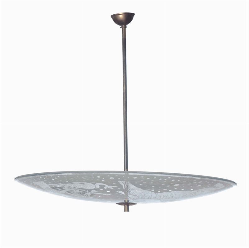 Lampada a sospensione produzione Fontana Arte su disegno Gio’ Ponti. Coppa incisa alla mola con rappresentazioni allegoriche, diametro cm 70.Documentazione dell’archivio Ponti (Gio’ Ponti Archives expertives 12091/000). Italia 1930 ca.