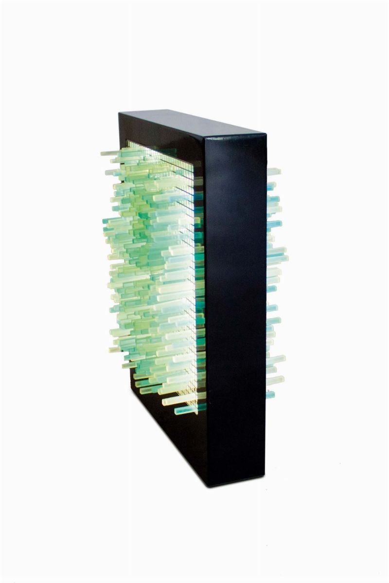 Lampada modello “G999” da tavolo a luce diffusa e colorata, scatola in metallo laccato nero e diffusori in metacrilato trasparente e colorato.Produzione New Lamp, Italia 1970 ca.