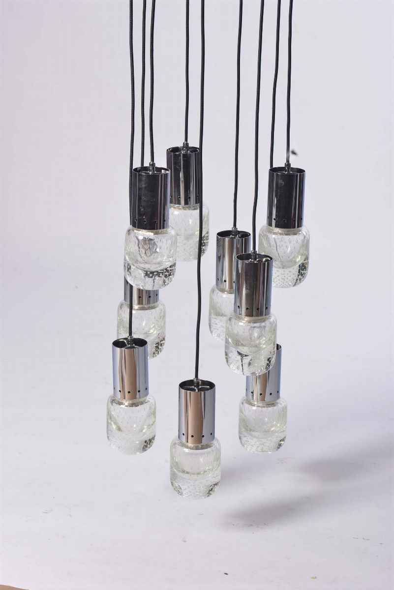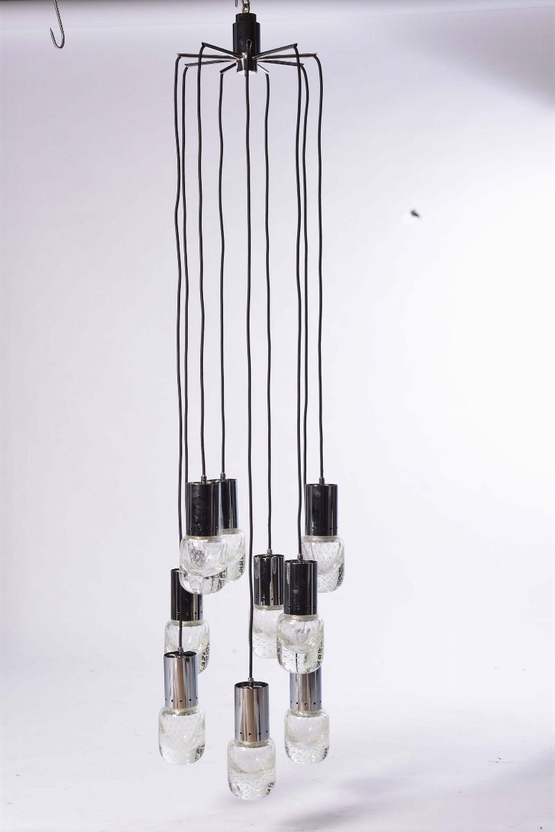 coppia di lampade da soffitto con bulbo in vetro di Murano a bollicine, struttura in metallo cromato.altezza cm 150, diametro cm 30.Prod. Seguso, Italia 1970 ca.