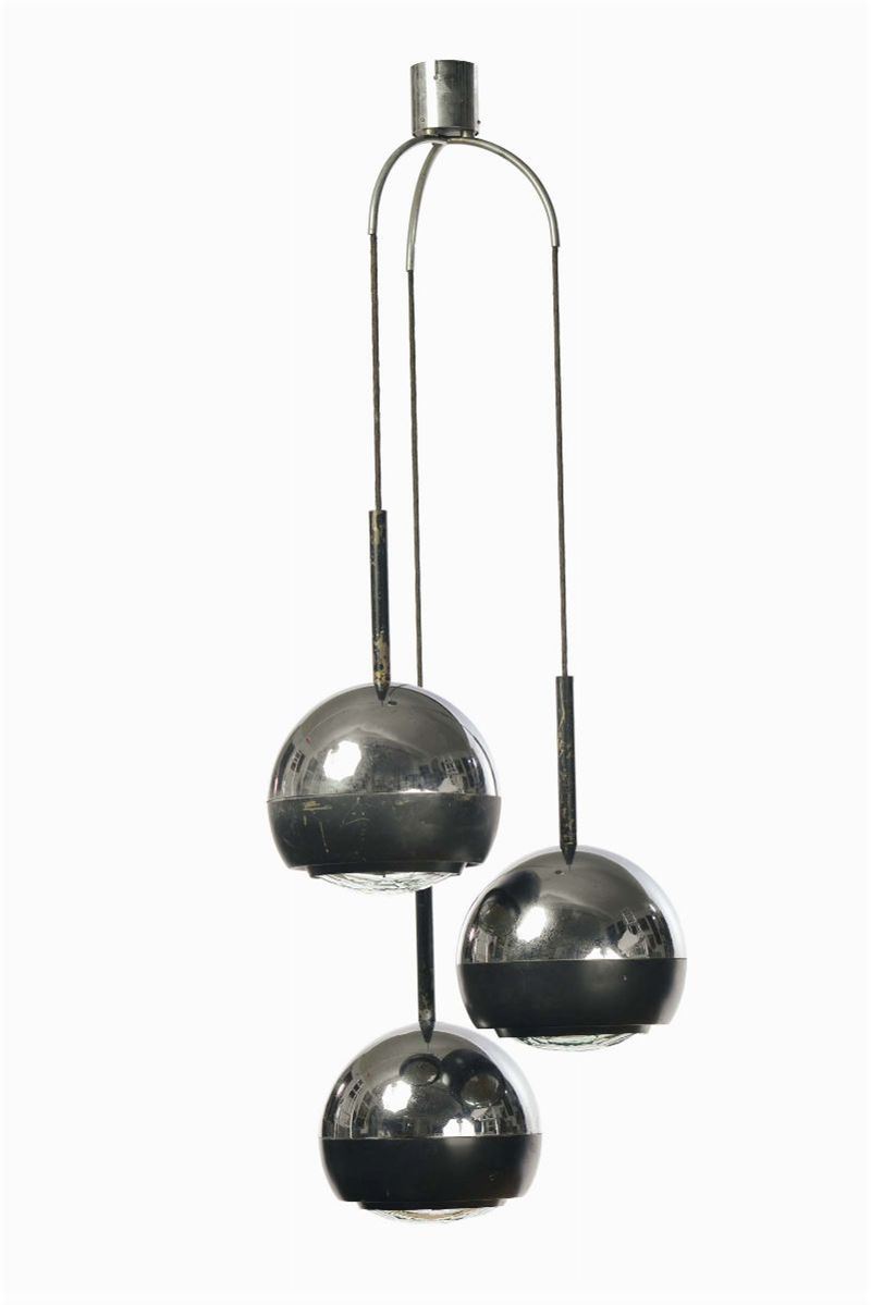 Lampade a sospensione a tre riflettori in ottone cromato, metallo verniciato e lente in vetro trasparente molato a diamante. Produzione Stilnovo, Italia 1960 ca., altezza cm 130 ca, diametro coppa cm 22