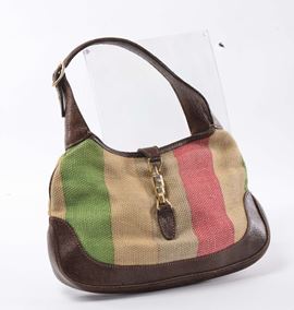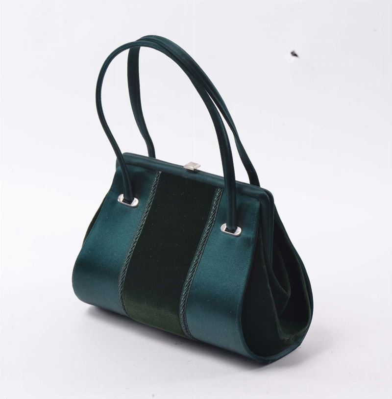composto da una Gucci in cuoio e canapa decorata a striscie e da una borsetta da sera in raso e velluto tonalità del verde.