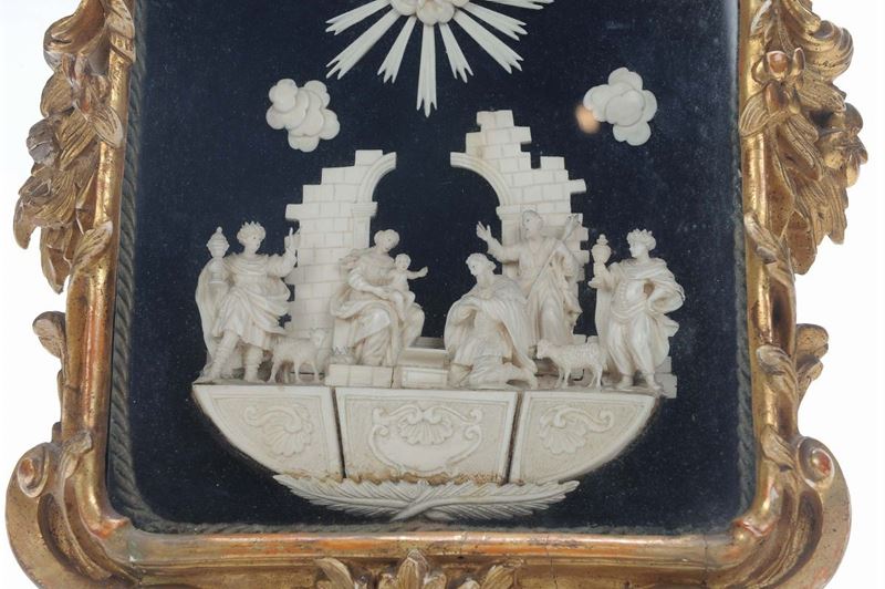 Bassorilievo con Adorazione dei Magi in avorio entro cornice dorata, XVIII secolo