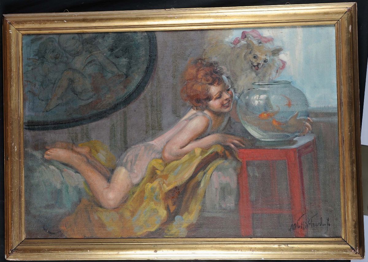 Mattia Traverso (1885-1956) Bimba con pesci rossi e cagnolino