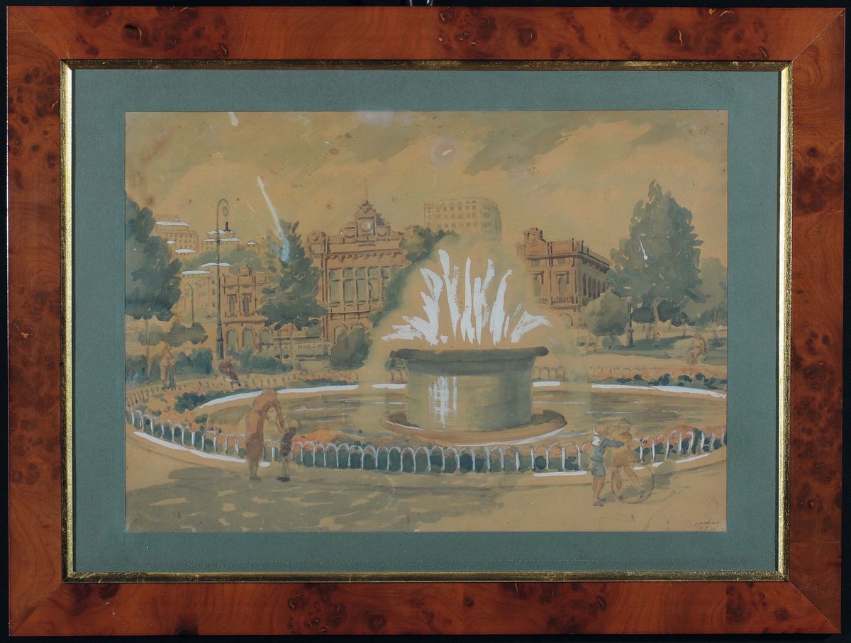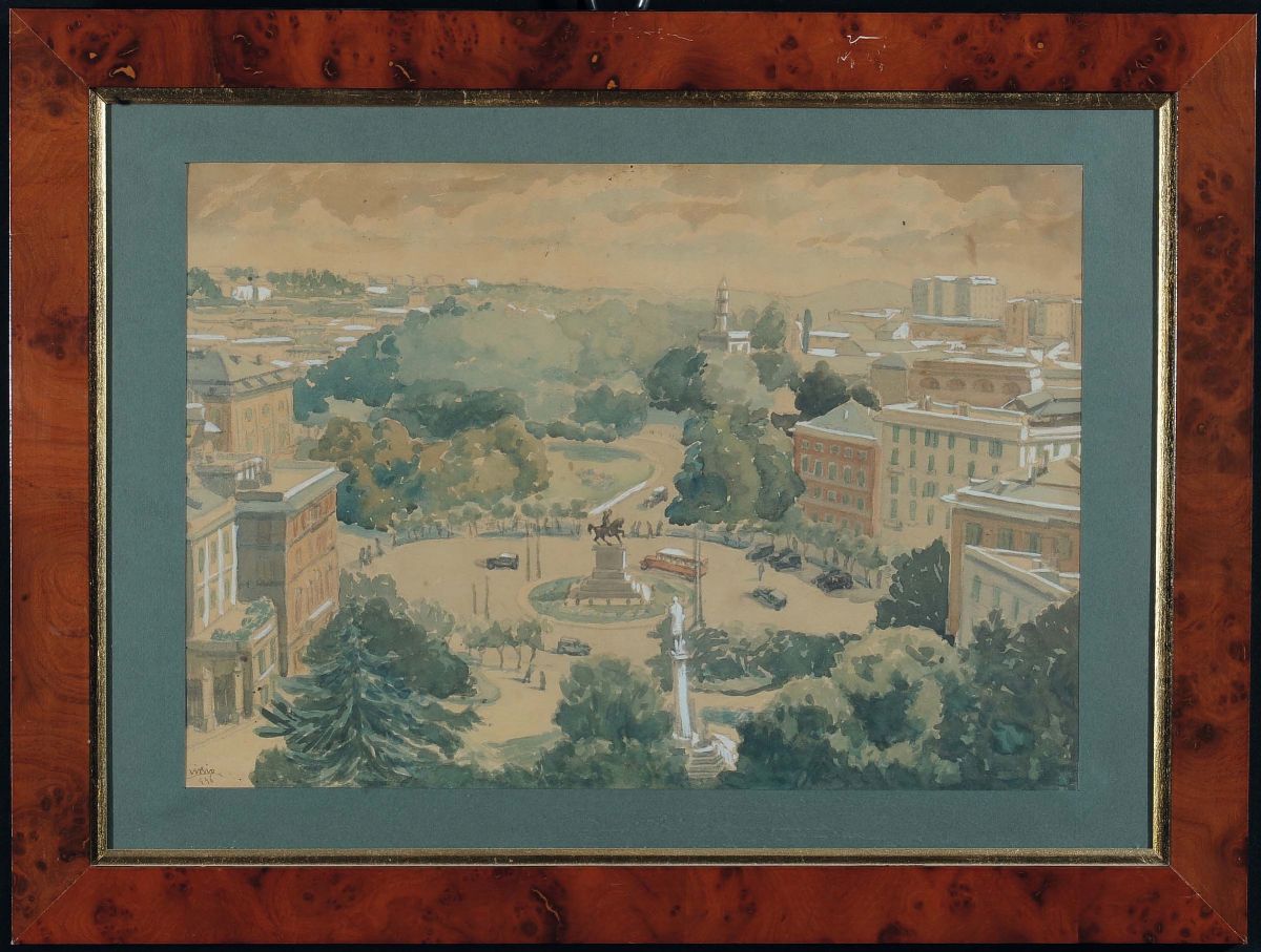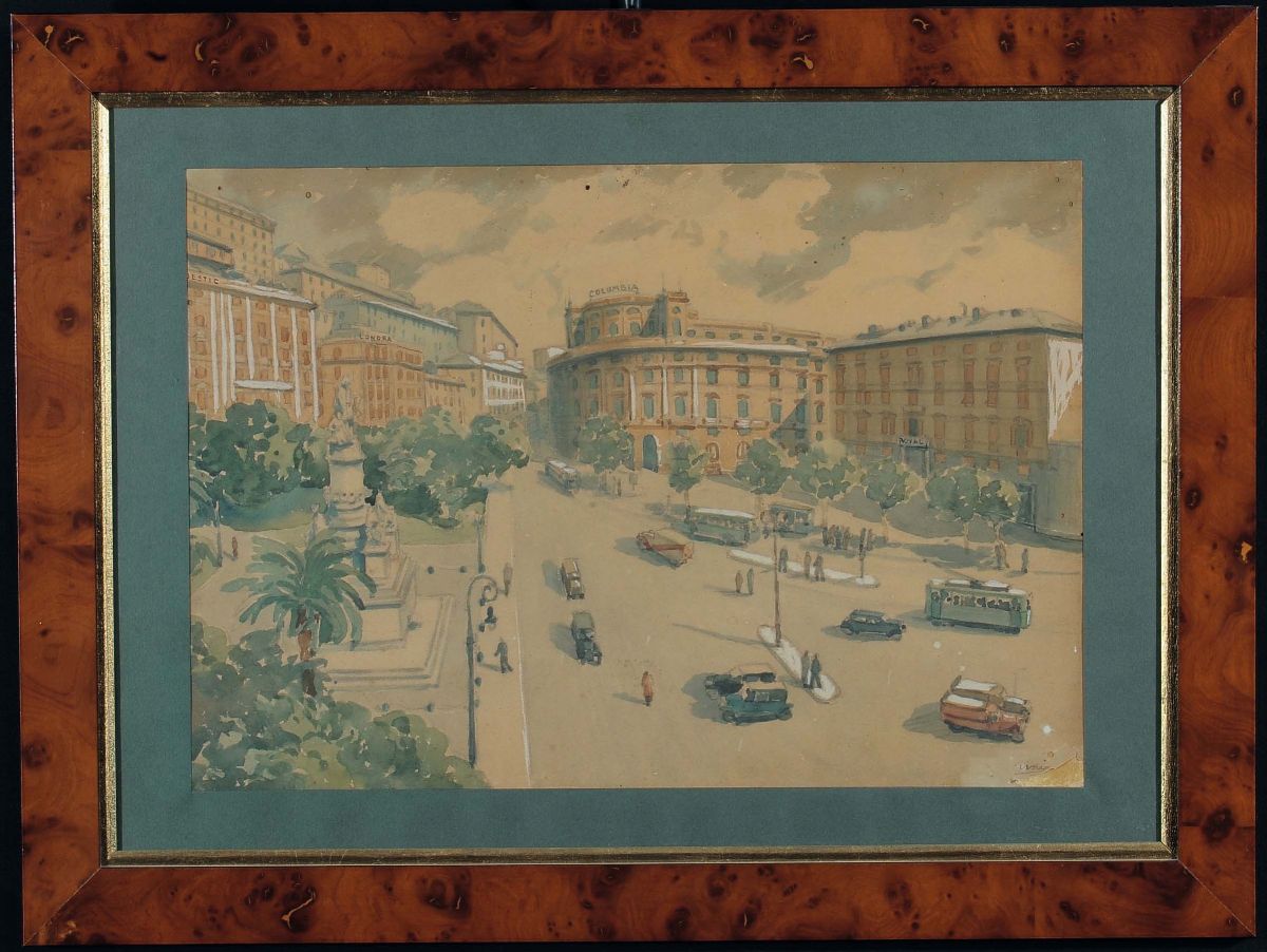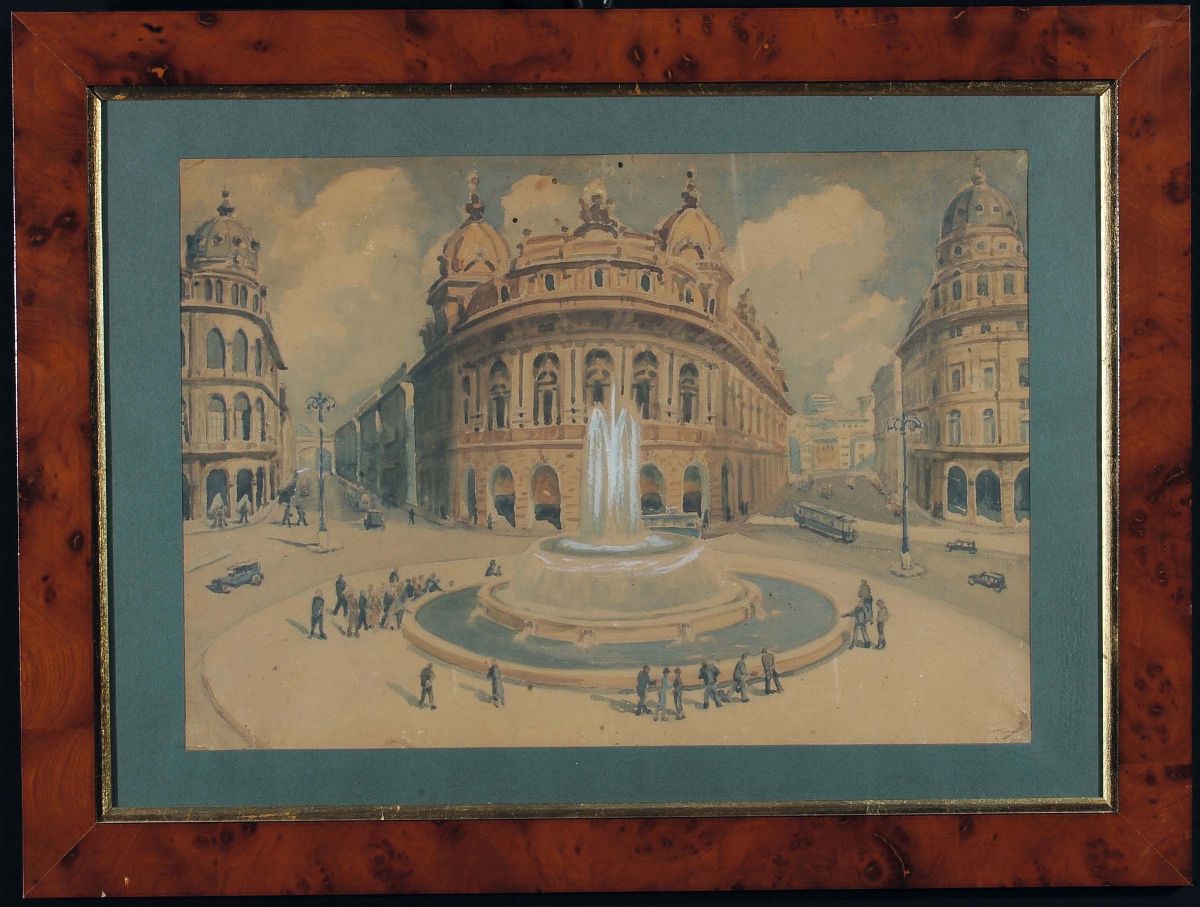 cinque acquerelli raffiguranti piazza Corvetto, piazza De Ferrari, piazza Acquaverde, piazza Verdi e corso Italia entro cornici in radica, cm 30,5x43,5