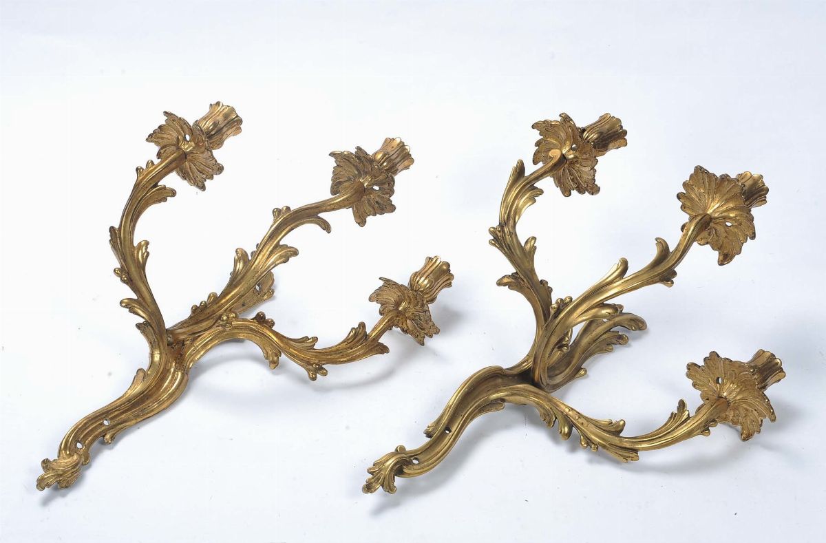 Coppia di appliques in bronzo dorato a tre fiamme, XIX secolo