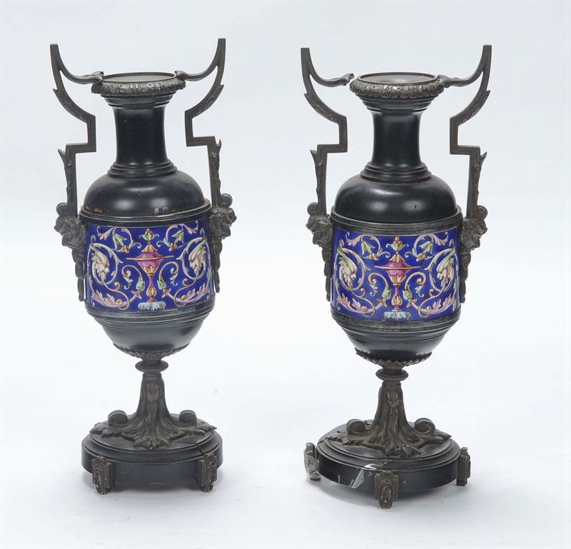 Coppia di vasetti ad anfora con decorazioni a smalto, XIX secolo