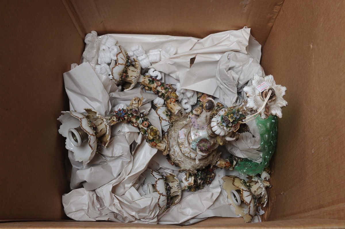 Lampadario in porcellana con fiori in rilievo