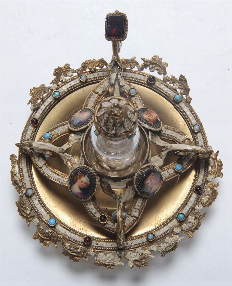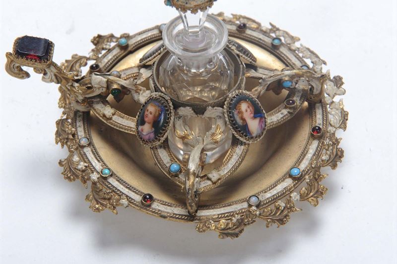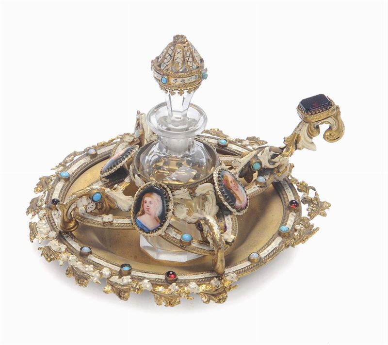 Piccola bugia portaprofumi in avorio con miniature a smalto