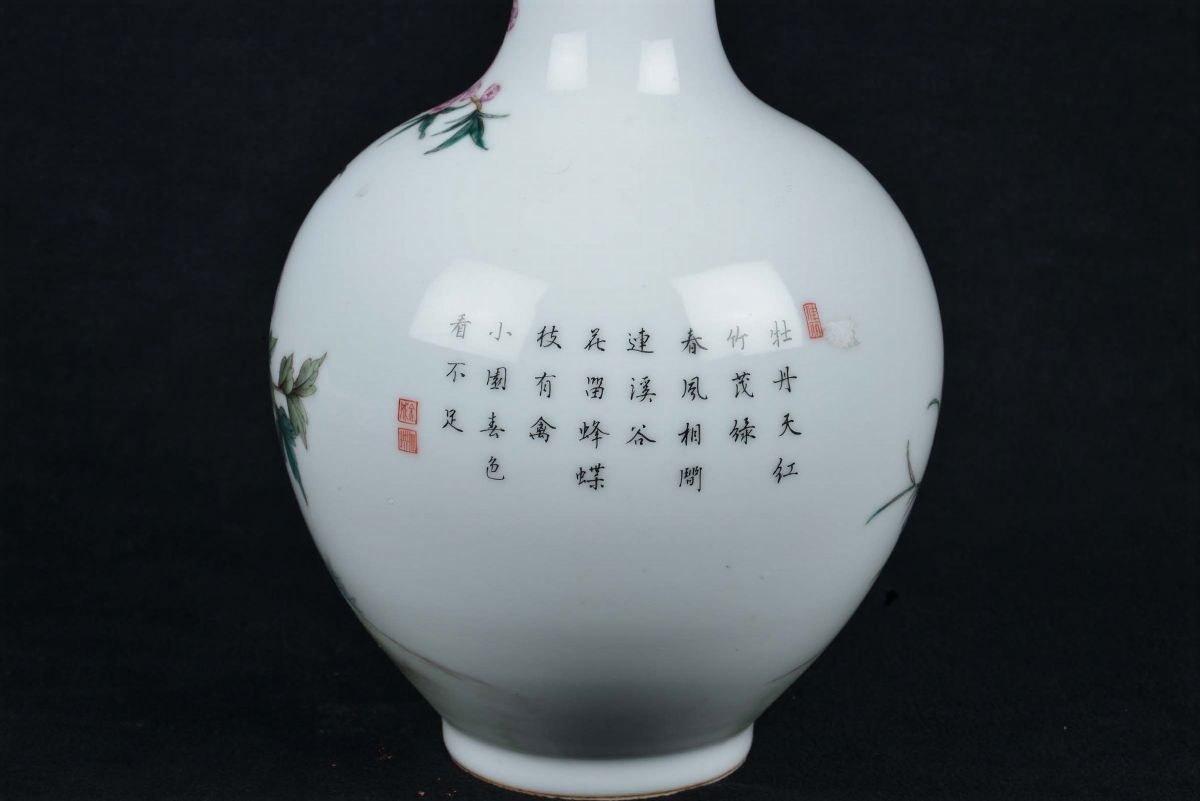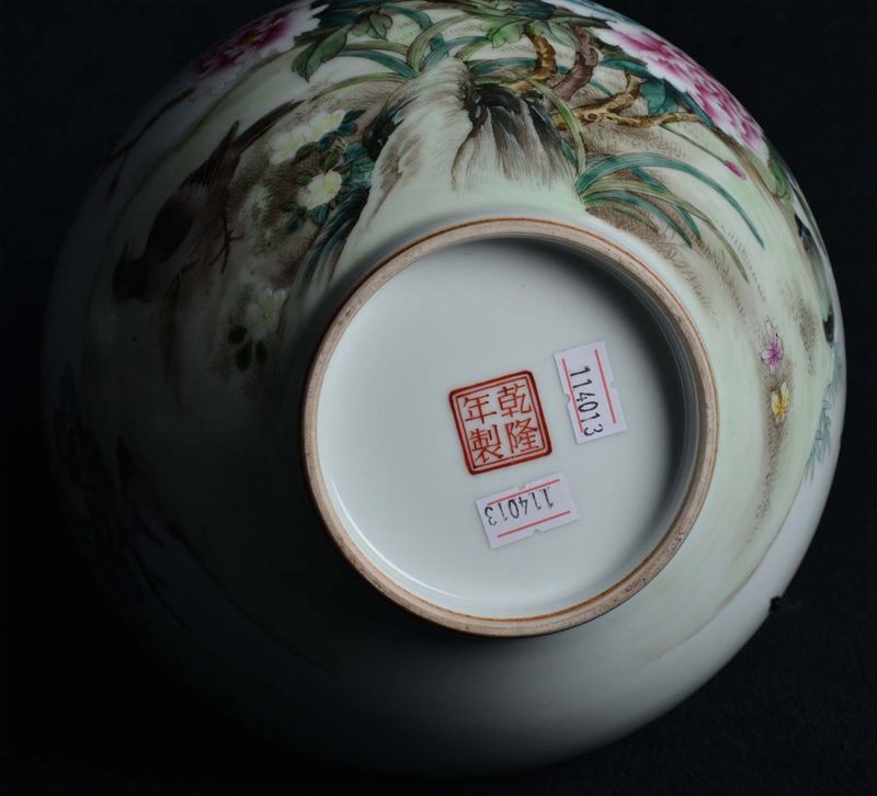Polychrome Famille Rose porcelain vase with naturalistic subject, China, Republican Period, 20th century h cm 31,5, post marked Qianlong