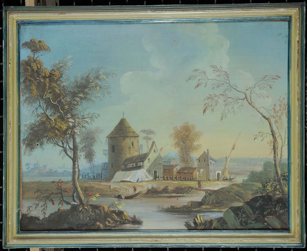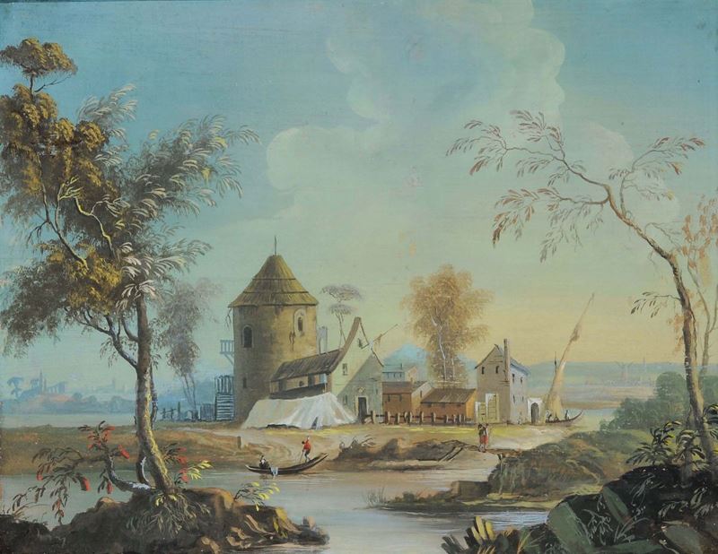 Scuola Romana del XIX secolo Paesaggio fluviale con ponte Paesaggio fluviale con casolare