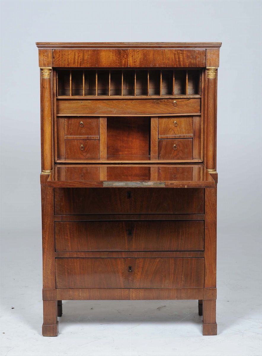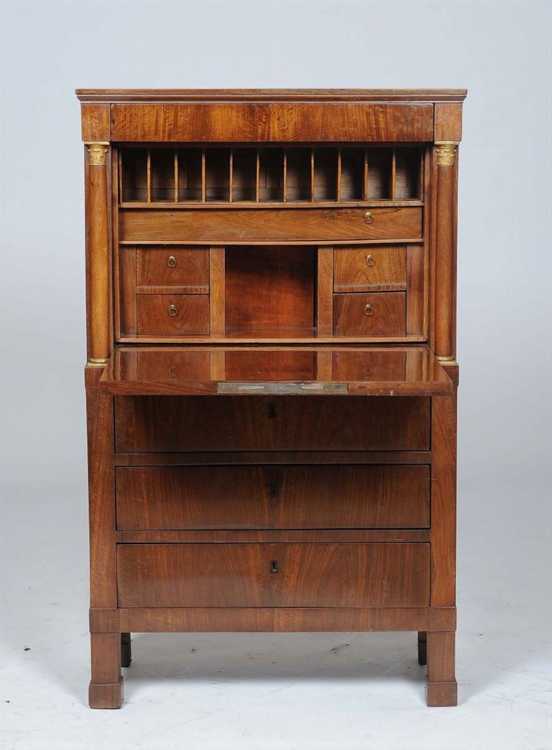 Secretaire Impero lastronato in noce con colonne e capitelli in legno dorato, Lucca XIX secolo