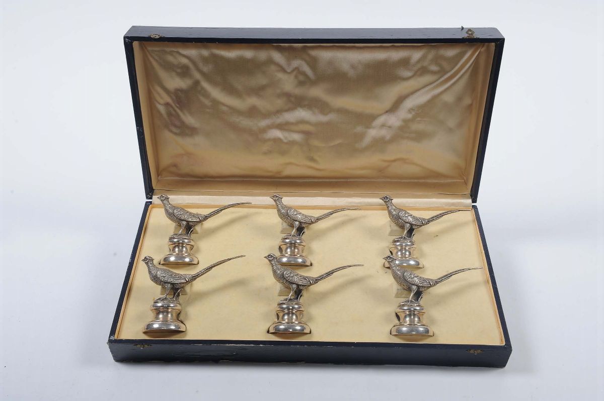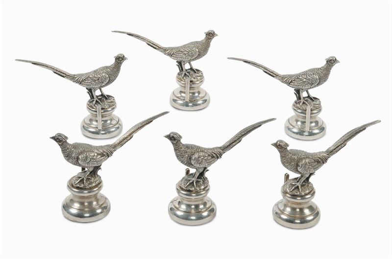 Sei segnaposto in argento raffiguranti fagiani, Argentiere Miracoli XX secolo