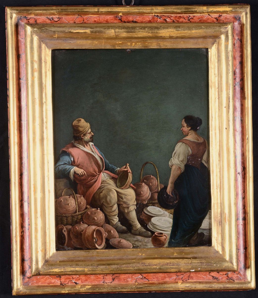 Perizia di Davide Dotti. [...] Sulla scorta dell’analisi del dato stilistico-formale e dello scioglimento del monogramma costituito dalle due lettere “G” intrecciate che l’artista ha apposto su entrambe le opere, è stato relativamente semplice identificare l’autore dei due rami nel raro pittore emiliano Giorgio Giacoboni. [...] L’analisi delle sue opere eseguite durante il soggiorno romano, a cui io credo appartenga l’inedito pendant in oggetto, rivela tangenze non solo con i lavori dei cosiddetti “bamboccianti” della prima e seconda generazione (Jean Miel e Paolo Monaldi), ma anche riflessi di quanto Giacoboni potè assimilare negli anni della formazione in terra emiliana. Penso, ad esempio, alle “popolari” scene di genere di Giuseppe Maria Crespi, Giuseppe Gambarini e di Stefano Ghirardini e ai gustosi interni fiamminghi di David Teniers e Cornelis de Wael che circolavano sul mercato nord italiano. [...]