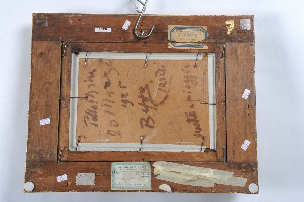 olio su tavoletta, cm 31x25, firmato in basso a sinistra; sul retro titolo, firma e data; etichette e timbri della Galleria Arte Nuova di Cuneo e Courmayeur