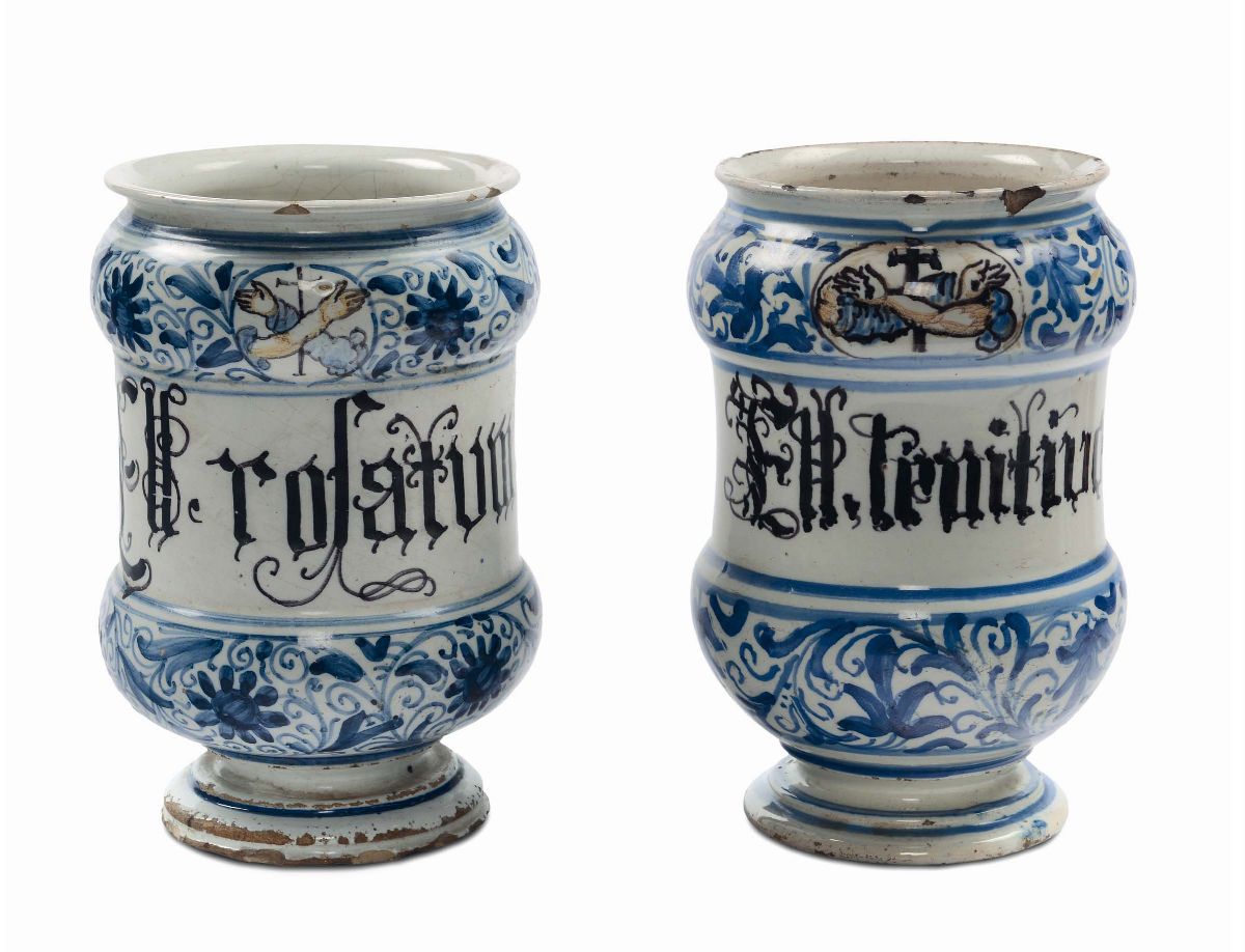 Coppia di albarelli di farmacia a decoro calligrafico naturalistico, XVIII secolo