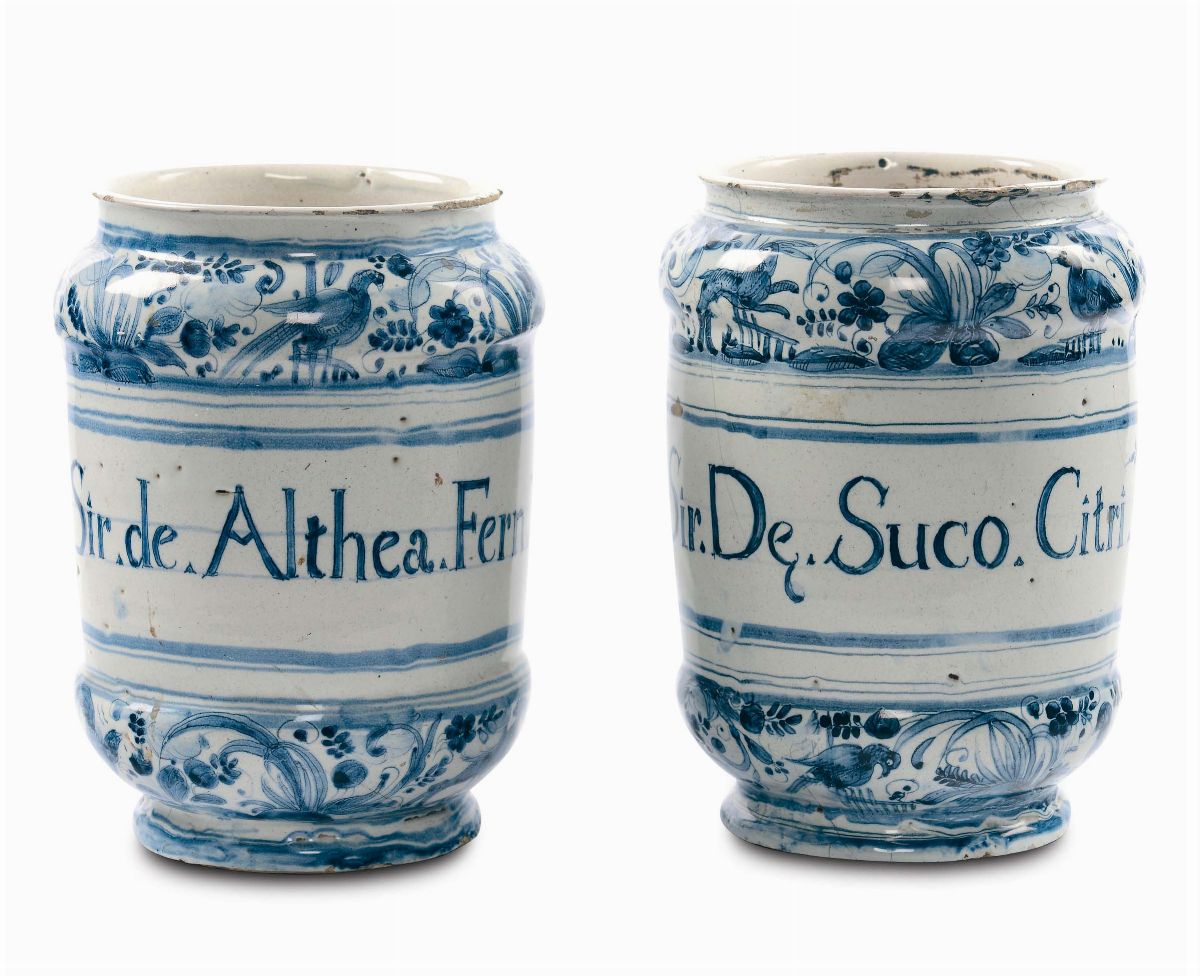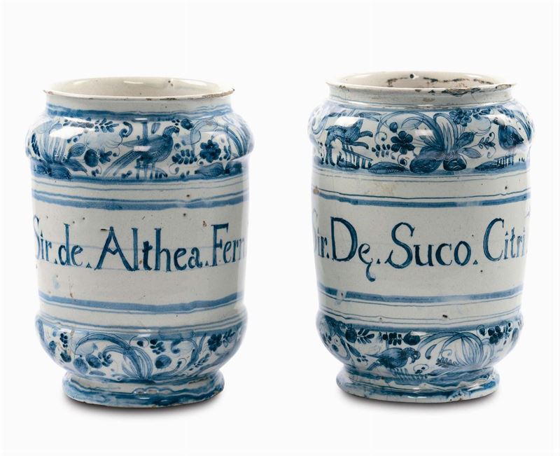 Coppia di grandi albarelli di farmacia in maiolica con decoro calligrafico naturalistico, Albisola inizio XVIII secolo