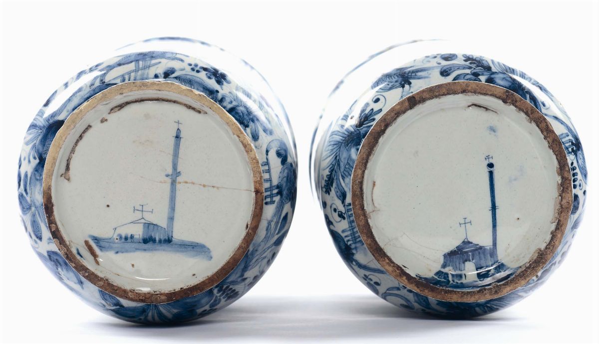 corpo a rocchetto con alta fascia cilindrica centrale occupata dal cartiglio epigrafico, decoro in monocromia turchina con animali ed elementi vegetali, marca “Chiesina”, altezza cm 25 (restauri)