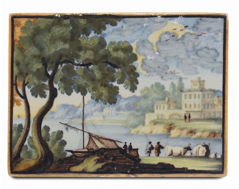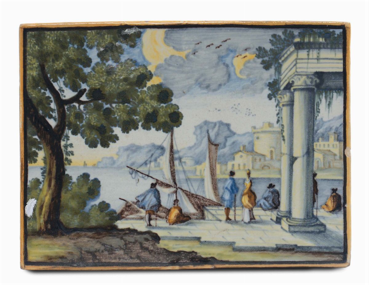 Coppia di piccole mattonelle in maiolica raffiguranti paesaggi costieri, Castelli XVIII secolo