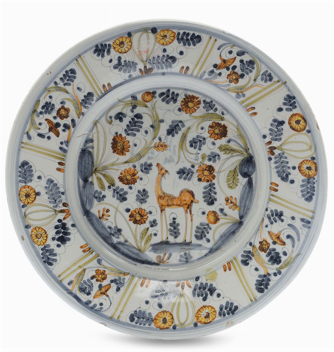 motivi vegetali e floreali sulla tesa, centro del cavetto con cervo, piede cilindrico, marca stella, diametro cm 32