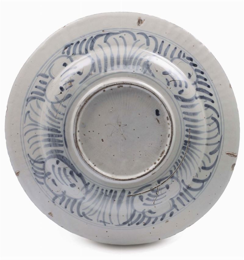 Piatto in maiolica a decoro calligrafico naturalistico, Savona (?) XVII secolo