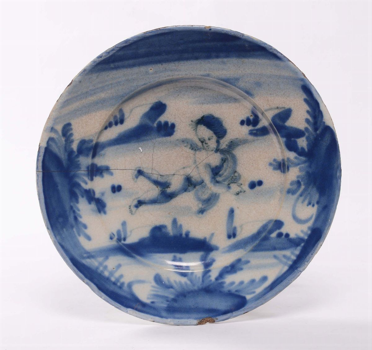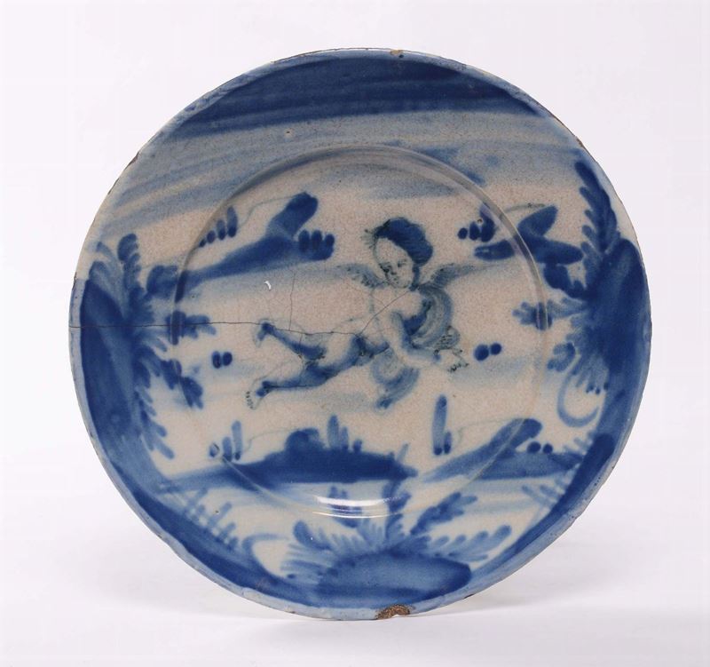 decoro raffigurante putto alato entro paesaggio campestre, diametro cm 28 (difetti)